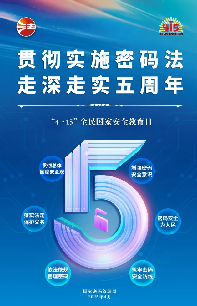 2024年4月15日是第九个全民国家安全教育日,今年密码安全宣传教育活动主题是“贯彻总体国家安全观,统筹高质量发展和高水平安全,增强密码安全意识,为推进中国式现代化筑牢密码防线”。